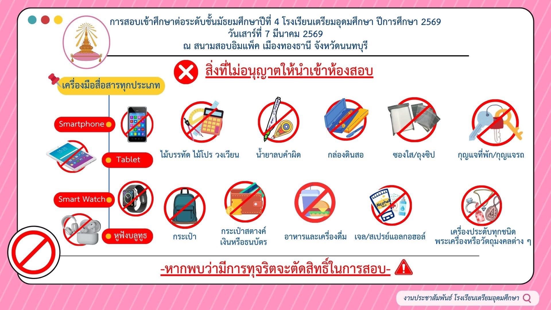 ดังนั้น ถ้าผู้ปกครองหรือเด็กที่จะเข้าสอบ อ่านข้อบังคับที่ทางโรงเรียนได้แจ้งไป ก็จะทราบดี โดยสิ่งที่สามารถนำเข้าห้องสอบได้มีไม่กี่อย่าง เช่น ดินสอ ปากกา บัตรประจำตัวสอบ ซึ่งต้องวางไว้บนโต๊ะ ส่วนข้อห้ามมีจำนวนมาก ทั้งลิควิดเปเปอร์ เครื่องคิดเลข กระเป๋า ธนบัตร ฯลฯ รวมถึงกระดาษทุกชนิด เพราะมีโอกาสที่จะเกิดการทุจริตได้ ซึ่งข้อห้ามดังกล่าวมีมานานแล้ว ไม่ใช่เพิ่งกำหนดขึ้น และนักเรียนที่เข้าสอบทราบดี” ดร.บุณยพงศ์ กล่าว