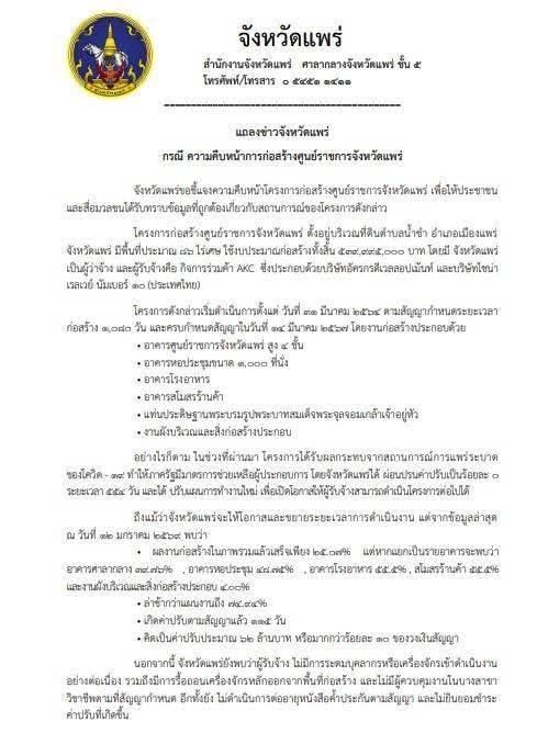 เมื่อวานนี้ (9 มี.ค.) นายสมชัย เลิศประสิทธิพันธ์ ผู้ว่าราชการจังหวัดแพร่ ได้แชร์โพสต์จังหวัดแพร่ ชี้แจงความคืบหน้าโครงการก่อสร้างศูนย์ราชการจังหวัดแพร่ หลังมีกระแสข่าวว่าผู้รับเหมาทิ้งงาน ระบุว่า โครงการก่อสร้างศูนย์ราชการจังหวัดแพร่ ตั้งอยู่บริเวณที่ดินตำบลน้ำชำ อำเภอเมืองแพร่ จังหวัดแพร่ มีพื้นที่ประมาณ 86 ไร่เศษ ใช้งบประมาณก่อสร้างทั้งสิ้น 539,995,000 บาท โดยมีจังหวัดแพร่เป็นผู้ว่าจ้าง และผู้รับจ้างคือ กิจการร่วมค้า AKC ประกอบด้วย บริษัทอัครกรดีเวลลอปเม้นท์ และบริษัทไชน่า เรลเวย์ นัมเบอร์ 10 (ประเทศไทย)