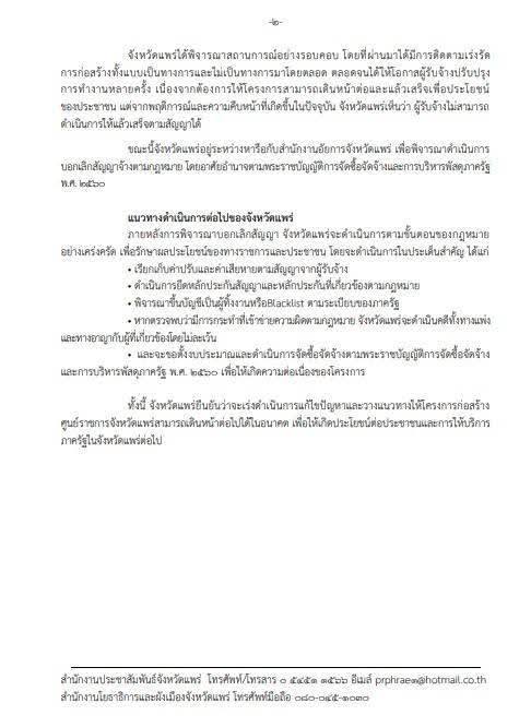 จังหวัดแพร่ได้พิจารณาสถานการณ์อย่างรอบคอบ โดยที่ผ่านมามีการติดตามเร่งรัดการก่อสร้าง ทั้งแบบเป็นทางการและไม่เป็นทางการมาโดยตลอด ตลอดจนได้ให้โอกาสผู้รับจ้างปรับปรุงการทำงานหลายครั้ง เนื่องจากต้องการให้โครงการสามารถเดินหน้าต่อและแล้วเสร็จเพื่อประโยชน์ของประชาชน