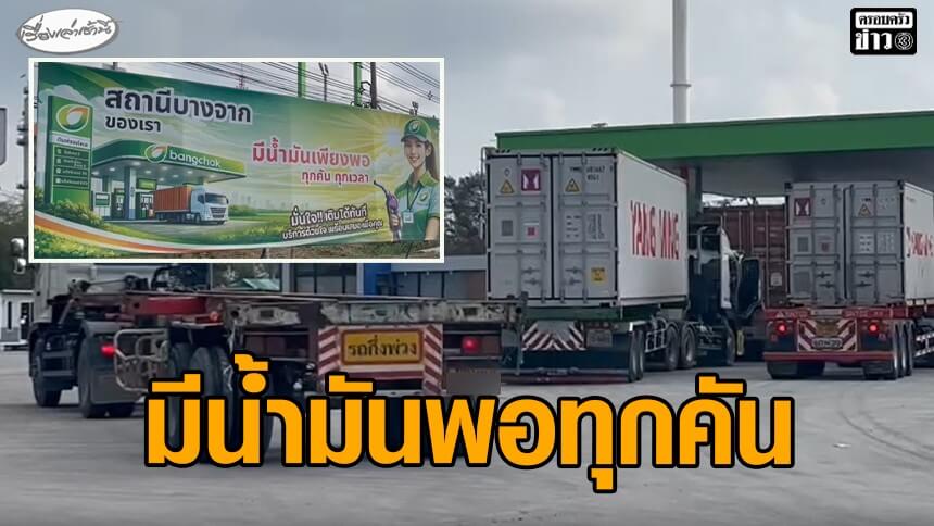 ปั๊มน้ำมันบ้านทุ่ง ติดป้าย "มีน้ำมันเพียงพอทุกคัน ทุกเวลา" รถบรรทุกแห่ต่อคิวยาวเติมน้ำมัน