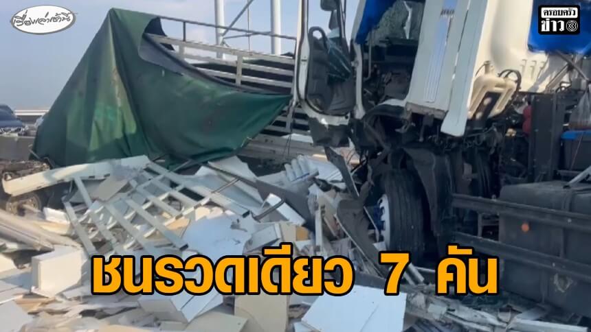ระทึก รถพ่วงเบรกไม่อยู่ ชนยับ 7 คันรวด กลางทางด่วนบูรพาวิถี เจ็บระนาว