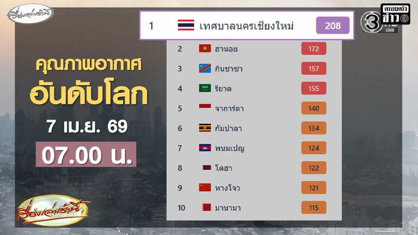 ภาคเหนือระทมฝุ่น เชียงใหม่อันดับ 1 โลก 10 วันติด แต่มีแนวโน้มดีขึ้น