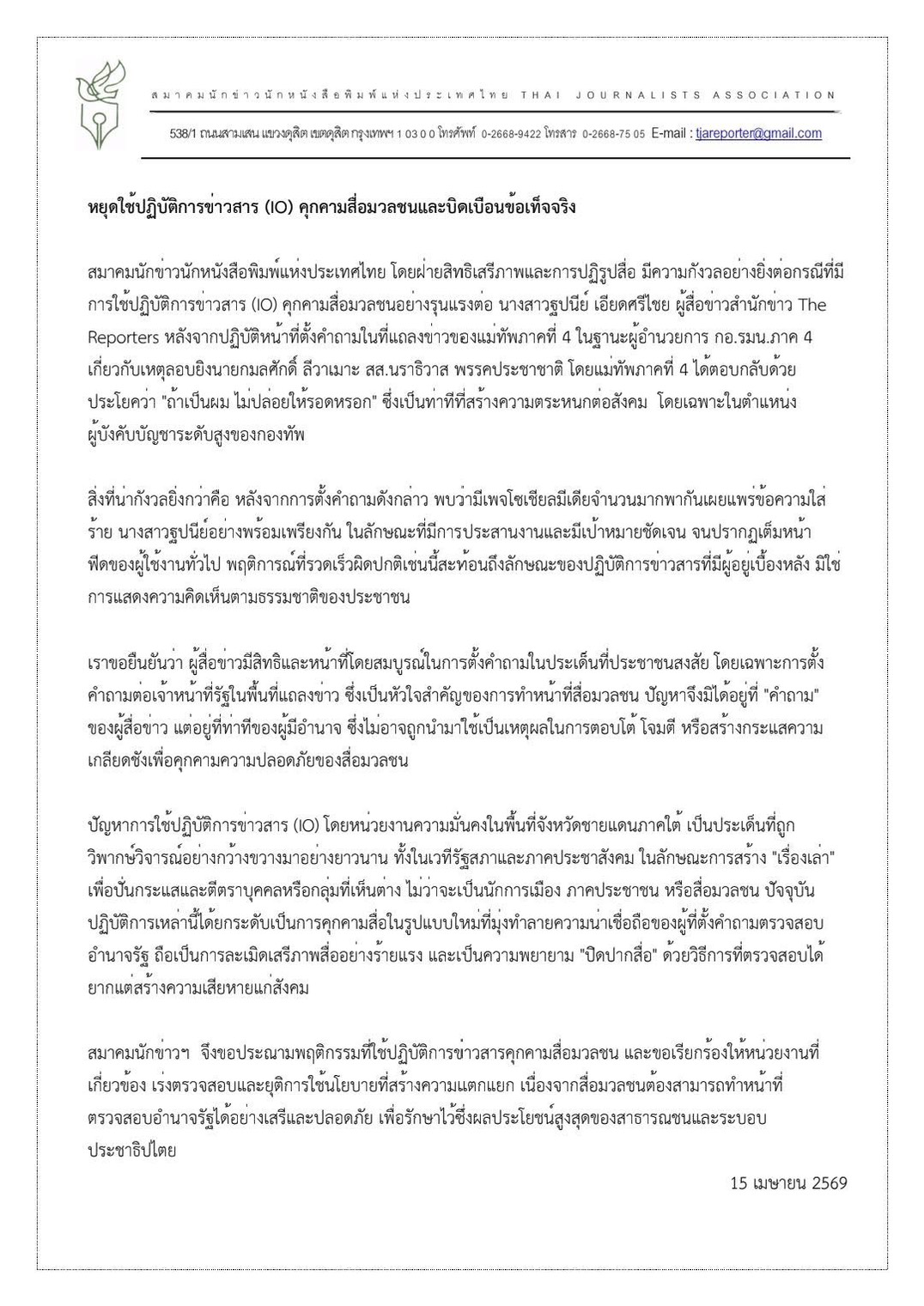 เราขอยืนยันว่า ผู้สื่อข่าวมีสิทธิและหน้าที่โดยสมบูรณ์ในการตั้งคำถามในประเด็นที่ประชาชนสงสัย โดยเฉพาะการตั้งคำถามต่อเจ้าหน้าที่รัฐในพื้นที่แถลงข่าว ซึ่งเป็นหัวใจสำคัญของการทำหน้าที่สื่อมวลชน ปัญหาจึงมิได้อยู่ที่ "คำถาม" ของผู้สื่อข่าว แต่อยู่ที่ท่าทีของผู้มีอำนาจ ซึ่งไม่อาจถูกนำมาใช้เป็นเหตุผลในการตอบโต้ โจมตี หรือสร้างกระแสความเกลียดชังเพื่อคุกคามความปลอดภัยของสื่อมวลชน