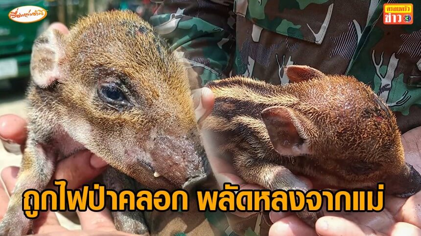 สุดสงสาร “ลูกหมูป่า” หนีตายไฟป่าเชียงดาว จ.เชียงใหม่ ถูกไฟคลอก-พลัดหลงจากแม่ สภาพอิดโรย อ่อนแรง ขาดน้ำ ชาวบ้านช่วยทันหวุดหวิด ตั้งชื่อ “เจ้าบุญรอด”