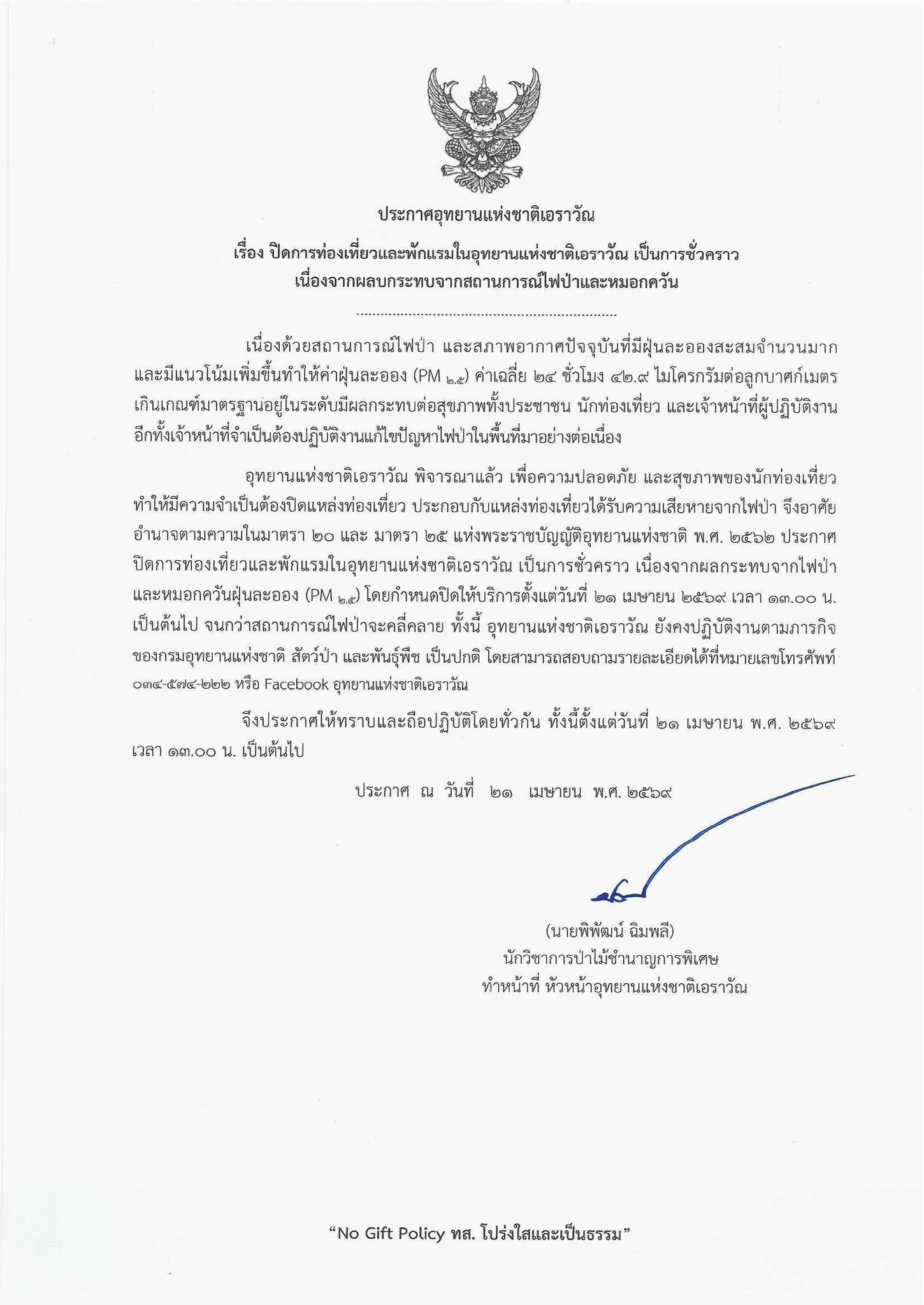อุทยานแห่งชาติเอราวัณ พิจารณาแล้ว เพื่อความปลอดภัย และสุขภาพของนักท่องเที่ยว ทำให้มีความจำเป็นต้องปิดแหล่งท่องเที่ยว ประกอบกับแหล่งท่องเที่ยวได้รับความเสียหายจากไฟป่า จึงอาศัยอำนาจตามความในมาตรา 20 และ มาตรา 25 แห่งพระราชบัญญัติอุทยานแห่งชาติ พ.ศ. 2562 ประกาศปิดการท่องเที่ยวและพักแรมในอุทยานแห่งชาติเอราวัณ เป็นการชั่วคราว เนื่องจากผลกระทบจากไฟป่า และหมอกควันฝุ่นละออง (PM 2.5)