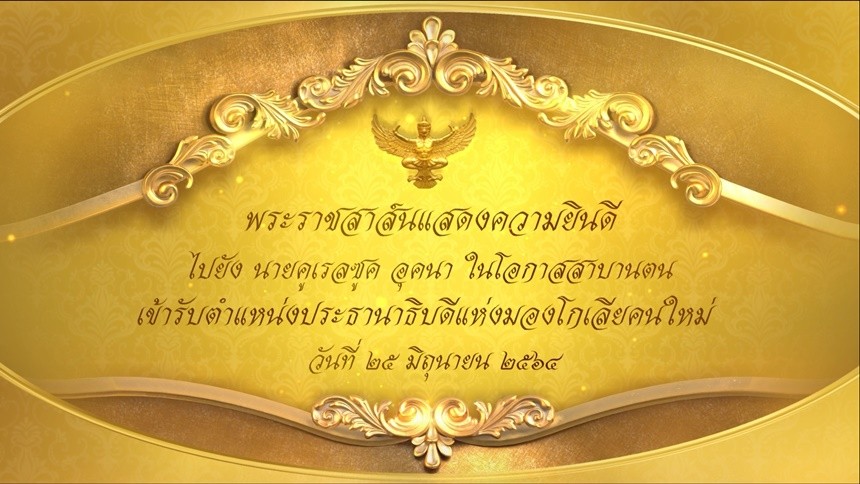 พระบาทสมเด็จพระเจ้าอยู่หัว ทรงพระกรุณาโปรดเกล้าโปรดกระหม่อม ให้ส่งข้อความพระราชสาส์น แสดงความยินดีไปยัง นายคูเรลซูค อุคนา ในโอกาสสาบานตน เข้ารับตำแหน่งประธานาธิบดี แห่งมองโกเลียคนใหม่