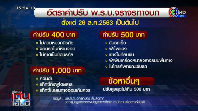 - ค่าปรับ 400 บาท ได้แก่ ไม่สวมหมวกนิรภัย / จอดรถในที่ห้ามจอด และไม่คาดเข็มขัดนิรภัย