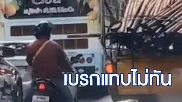 คลิปหวาดเสียว กระบะบรรทุกเหล็กเส้นยื่นออกมากลางถนน จยย.หวิดซิ่งเสยหลายคัน