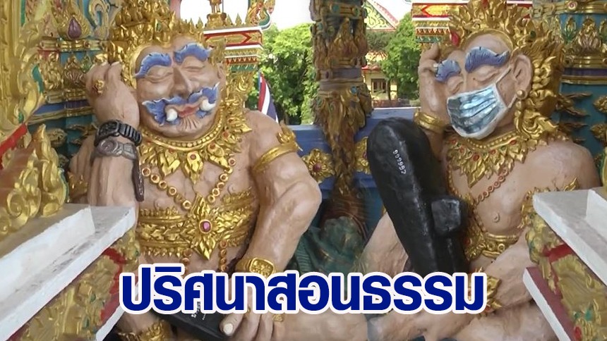 รูปปั้นหน้าโบสถ์ที่วัดแห่งหนึ่งในโคราช เป็นรูปยักษ์ 2 ตน นั่งหลับอุ้มเรือดำน้ำ อีกตนใส่นาฬิกาที่ยืมเพื่อนมา เจ้าอาวาสเผยตั้งใจทำเป็นปริศนาสอนธรรม