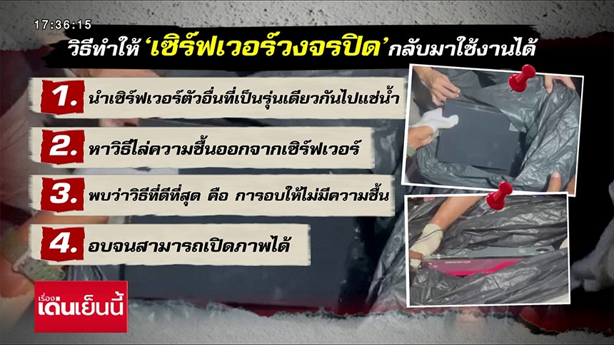 มีรายงานจากชุดกู้ข้อมูลเซิร์ฟเวอร์ เปิดเผยว่า หลังจากได้รับเซิร์ฟเวอร์มาแล้ว เจ้าหน้าที่ต้องเร่งทำเซิร์ฟเวอร์ให้แห้ง เนื่องจากมีน้ำเข้าไปในถุงดำเป็นจำนวนมาก เพราะหากเปิดเซิร์ฟเวอร์โดยที่เครื่องยังมีความชื้นจะทำให้เครื่องช็อต และข้อมูลทั้งหมดอาจเสียหาย เจ้าหน้าที่จึงนำเซิร์ฟเวอร์ตัวอื่นซึ่งเป็นรุ่นเดียวกันกับของที่บ้านกำนันนก ไปแช่น้ำแล้วหาวิธีไล่ความชื้นออกจากเซิร์ฟเวอร์ เพื่อให้ได้วิธีที่ได้ผลและถูกต้องที่สุด