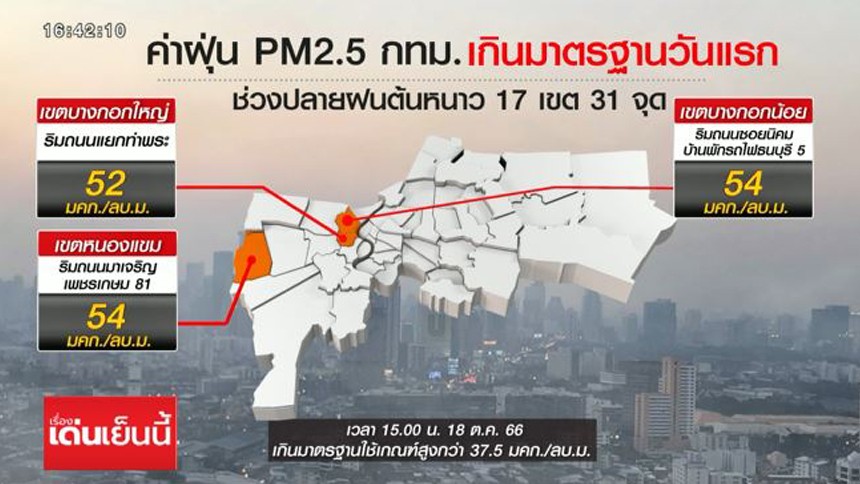 ต้อนรับค่ามาตรฐานฝุ่น PM2.5 ใหม่ ช่วงปลายฝนต้นหนาว กรมควบคุมมลพิษและกทม.เผย สถานการณ์ PM2.5เกินมาตรฐานเริ่มมีผลกระทบต่อสุขภาพวันแรก อยู่ในระดับสีส้ม ถึง 17 เขตในกรุงเทพฯ และปริมณฑล