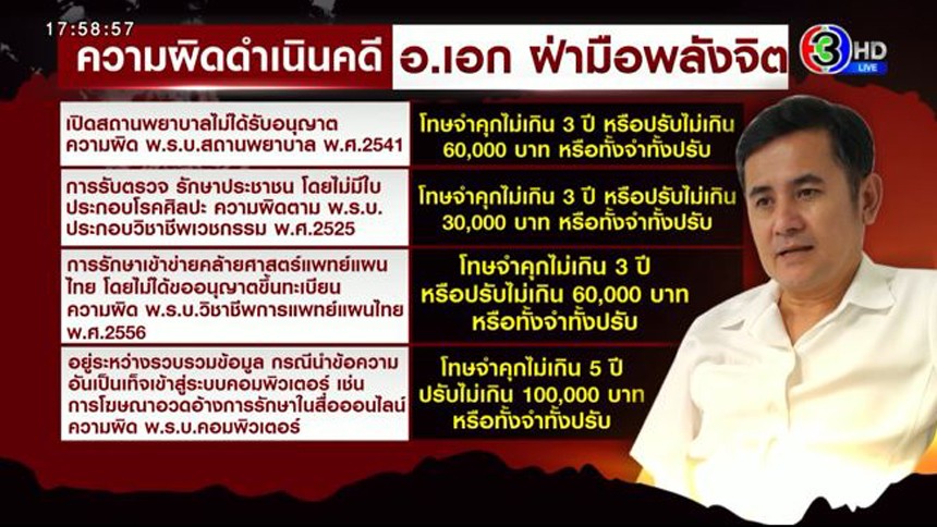 สำหรับความผิดเปิดสถานพยาบาลไม่ได้รับอนุญาต ผิด พ.ร.บ.สถานพยาบาล พ.ศ. 2541 / โทษจำคุกไม่เกิน 3 ปี หรือปรับไม่เกิน 60,000 บาท หรือทั้งจำทั้งปรับ / ความผิดการรับตรวจ รักษาประชาชน โดยไม่มีใบประกอบโรคศิลปะ ผิดตาม พ.ร.บ.ประกอบวิชาชีพเวชกรรม พ.ศ. 2525 / โทษจำคุกไม่เกิน 3 ปี หรือปรับไม่เกิน 30,000 บาท หรือทั้งจำทั้งปรับ /ความผิดการรักษาเข้าข่ายคล้ายศาสตร์แพทย์แผนไทย โดยไม่ได้ขออนุญาตขึ้นทะเบียน ผิด พ.ร.บ.วิชาชีพการแพทย์แผนไทย พ.ศ.2556 / โทษจำคุกไม่เกิน 3 ปี หรือปรับไม่เกิน 60,000 บาท หรือทั้งจำทั้งปรับ