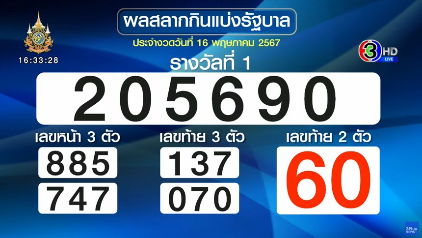 ผลสลากกินแบ่งรัฐบาล งวดวันที่ 16 พฤษภาคม 2567