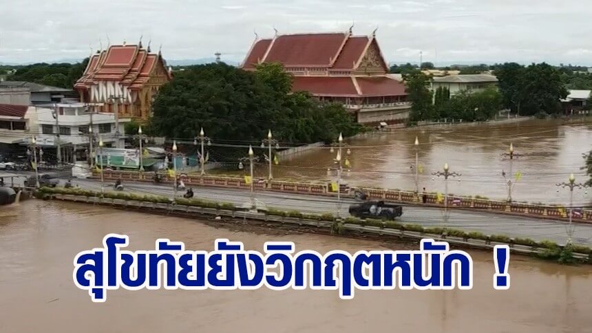 ปริมาณน้ำเหนือที่ไหลผ่านแม่น้ำยมในหลายพื้นที่นอกตัวเมือง จ.สุโขทัย ทำให้คันดินกั้นน้ำพังทลาย โดยที่ อ.ศรีสำโรง น้ำยมไหลเข้าท่วม 4 หมู่บ้าน ชาวบ้านอพยพหนีน้ำ
