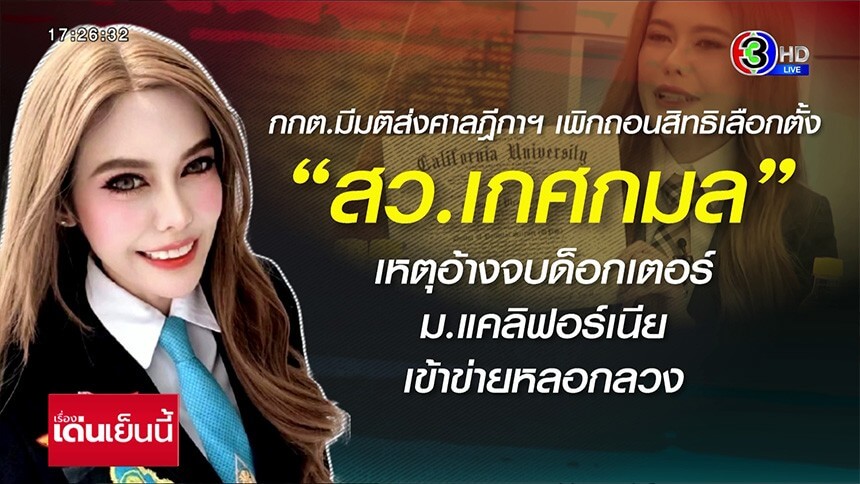 เรื่อง ของ สว.ศ.ดร.พญ. เกศกมล เปลี่ยนสมัย หลังจากถูกร้อง ให้ตรวจสอบ การแนะนำตัวในใบ สว.3 ในการเลือก สว. ที่ผ่านมา ว่า เป็นการหลอกลวงในผู้สมัคร สว. ด้วยกันหลงเชื่อหรือไม่ ที่สุดวันนี้ กกต. มีมติ เสียงข้างมาก ส่งเรื่องไปยังศาลฎีกา เพื่อเอาผิด สว.หมอเกศ ตามกฎหมายเลือก สว. แล้ว