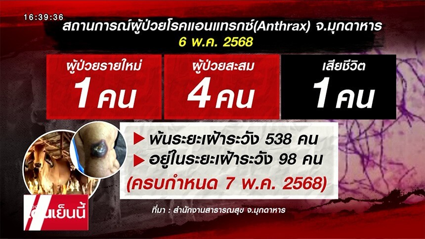 สธ.เผยพบผู้ป่วยแอนแทรกซ์เพิ่ม 1 ราย ในมุกดาหาร คาดต้นตอระบาดจาก "ดิน" ในพื้นที่ เร่งเก็บตัวอย่างตรวจ