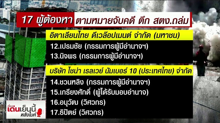 ออกหมายจับ 17 ผู้ต้องหา คดีตึก สตง.ถล่ม พบ "เปรมชัย" โดนด้วย