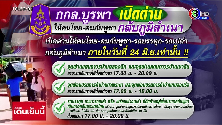 กองกำลังบูรพา อนุโลมเปิดด่านให้คนไทย-กัมพูชา กลับภูมิลำเนา วันนี้เท่านั้น 17.00-20.00 น.
