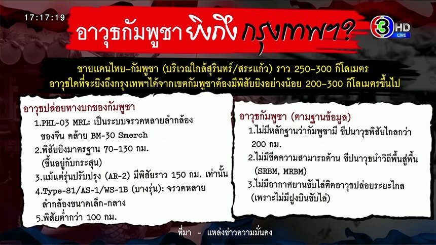 แหล่งข่าวระดับสูงหน่วยความมั่นคง เปิดเผยถึงกรณีคำกล่าวอ้างของสมเด็จ ฮุน เซนประธานวุฒิสภา และประธานองคมนตรีกัมพูชาว่า มีอาวุธยิงถึงกรุงเทพฯ ว่า จากการวิเคราะห์ยุทธศาสตร์และเทคนิคประเด็น: อาวุธกัมพูชายิงถึงกรุงเทพฯได้จริงหรือไม่นั้น ต้องดูว่าระยะทางจากชายแดนกัมพูชาถึงกรุงเทพฯ อยู่ห่างจากแนวชายแดนไทย–กัมพูชา ราว 250–300 กิโลเมตรโดยเฉลี่ย ดังนั้น อาวุธใดที่จะยิงถึงกรุงเทพฯได้จากเขตกัมพูชาต้องมีพิสัยยิงอย่างน้อย 200–300 กิโลเมตรขึ้นไป