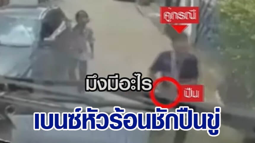 เบนซ์หัวร้อน ชักปืนขู่รถปูน เหตุฉุนหนักโดนขับจี้ท้าย คู่กรณีแจ้งความ อ้างปืนของเล่น