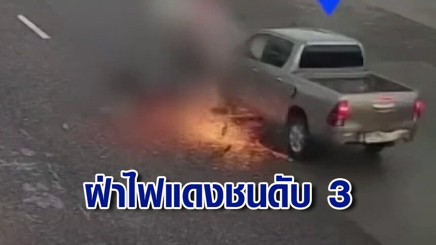 สลด 3 พ่อแม่ลูกขี่มอเตอร์ไซค์ผ่านสี่แยก ถูกกระบะฝ่าไฟแดงชนอย่างแรงจนไฟลุก แม่เสียชีวิตคาที่ ส่วนพ่อและลูกวัย 4 ขวบ เสียชีวิตที่โรงพยาบาล