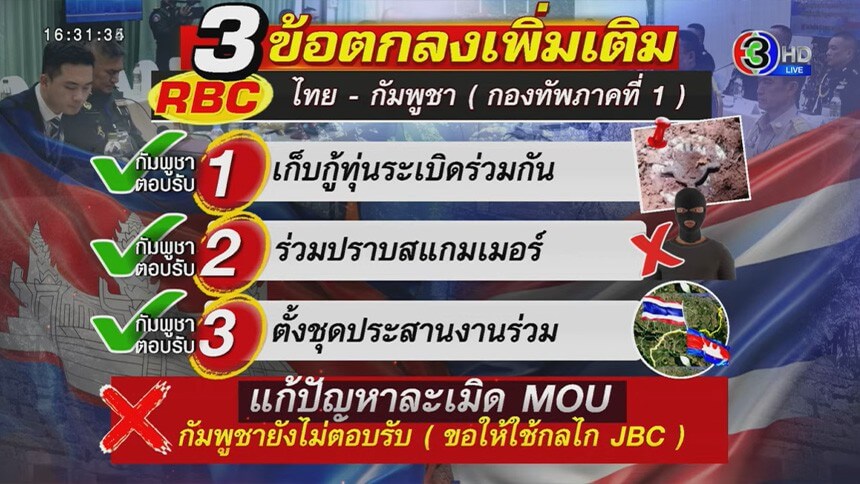 ในการประชุม RBC ไทย-กัมพูชา ส่วนของกองทัพภาคที่ 1 ที่จังหวัดสระแก้ว สรุปไทยเสนอไป 4 ข้อ ทางกัมพูชาตอบรับ 3 ข้อ ซึ่ง 1 ในนั้นคือการเก็บกู้ทุ่นระเบิดร่วมกัน