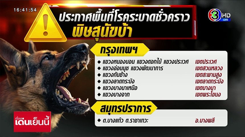 กทม.ประกาศเตือน 6 เขต และอำเภอบางพลี จ.สมุทรปราการ เป็นเขตโรคระบาดสัตว์ชั่วคราว จากพิษสุนัขบ้า ถึง 8 ตุลาคมนี้ หลังพบสุนัขป่วยโรคพิษสุนัขบ้า ที่เขตประเวศ เตือนประชาชนรัศมี 5 กม.ในพื้นที่ดังกล่าวหลีกเลี่ยงสัมผัสสัตว์จรจัดเด็ดขาด