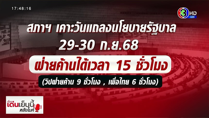 สภาฯเคาะวัน แถลงนโยบายรัฐบาล 29-30 ก.ย.นี้ ฝ่ายค้านได้เวลา 15 ชั่วโมง “ปกรณ์วุฒิ ”ลั่นแบ่งเท่ากันวิปฝ่ายค้าน 9 ชั่วโมง เพื่อไทย 6 ชั่วโมง