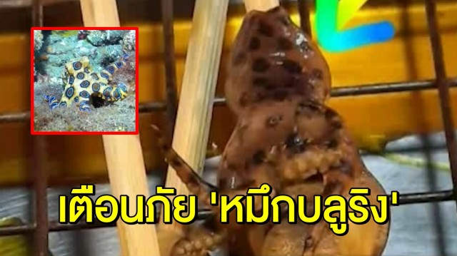 โดยวันที่ 30 พ.ย. 63 กรม ทช. โดยสถาบันวิจัย ทช. ได้รับแจ้งจากคุณจันทรา พุ่มแจ่ม แจ้งพบหมึกบลูริง เสียบไม้ปิ้งขายในตลาดนัดตอนเย็น พื้นที่ จ.ปทุมธานี แม้ว่าหมึกย่างจะอร่อยมากก็จริง ยิ่งเจอน้ำจิ้มรสเด็ดยิ่งแจ่ม แต่ให้สังเกตเพิ่มกันหน่อย ทั้งพ่อค้าแม่ค้าคัดแยกให้ดีก่อนเอามาปรุงอาหารขาย ลูกค้าก็เช่นกันก่อนบริโภคสังเกตลายสักนิด ถ้าพบหมึกมีลายเป็นวงๆ สีน้ำเงินทั่วตัวจนไปถึงเส้นหมวด ให้หลีกเลี่ยงด่วน อันตรายมากเพราะพิษของหมึกชนิดนี้ แม้ปรุงสุกก็ไม่สลาย ยังมีอันตราย พิษนี้ทนความร้อนได้สูงถึง 200 องศาเซลเซียส ดังนั้น แม้ย่างสุกก็ไม่สามารถทำลายพิษได้ ปัจจุบันยังไม่มียาแก้พิษใดๆ ต่อต้านได้