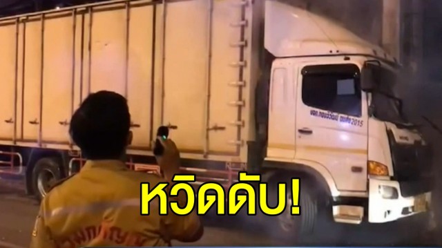 รถบรรทุกหลับใน พุ่งชนเสา-ไฟลุกท่วม โชเฟอร์หวิดดับ