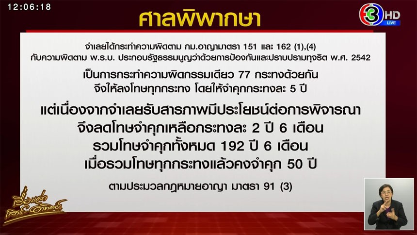 โดยศาลได้พิเคราะห์พบานหลักฐานแล้ว ได้อ่านคำพิพากษาว่า จำเลยได้กระทำความผิดตามกม.อาญามาตรา 151,และ162(1),(4)กับความผิดตาม พ.ร.บ.ประกอบรัฐธรรมนูญว่าด้วยการป้องกันและปราบปรามทุจริต พ.ศ.2542 เป็นการกระทำความผิดกรรมเดียว 77 กระทงด้วยกันจึงให้ลงโทษทุกกระทง โดยให้จำคุกกระทงละ 5 ปี แต่เนื่องจากจำเลยรับสารภาพมีประโยชน์ต่อการพิจารณา จึงลดโทษจำคุกเหลือกระทงละ 2 ปี 6 เดือน รวมโทษจำคุกทั้งหมด 192 ปี 6 เดือน เมื่อรวมโทษทุกประทงแล้วคงจำคุก 50 ปี ตามประมวลกฎหมายอาญา มาตรา 91(3)