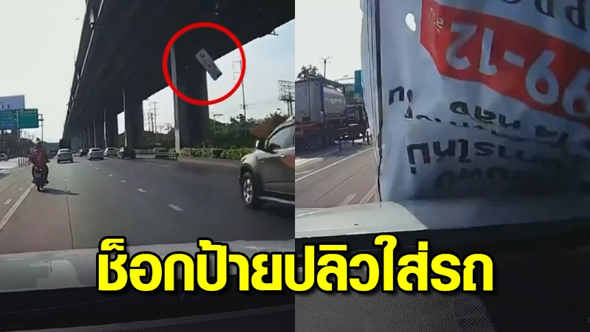 เมื่อวันที่ 17 มิ.ย.66 ในโลกออนไลน์ได้มีการแชร์คลิประทึก ขณะที่รถยนต์ขับมาตามทาง จู่ ๆ ได้มีป้ายโฆษณาปลิวตกมาใส่หน้ารถ