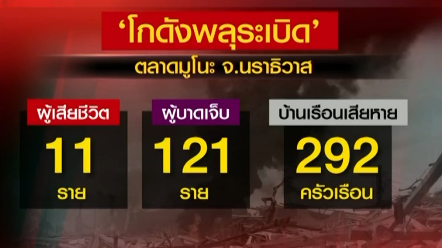 โกดังเก็บพลุระเบิด บริเวณตลาดมูโนะ อ.สุไหงโก-ลก จ.นราธิวาส มีผู้เสียชีวิต 11 ราย บาดเจ็บ 121 ราย บ้านเรือนเสียหายประมาณ 292 ครัวเรือน คาดสาเหตุจากสะเก็ดไฟที่ช่างมาต่อเติม ด้านชาวบ้านเล่านาทีระทึก