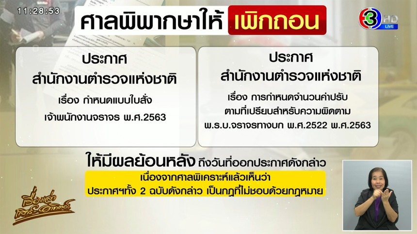 โดยศาลฯ พิพากษาให้เพิกถอนประกาศสำนักงานตำรวจแห่งชาติ เรื่อง กำหนดแบบใบสั่งเจ้าพนักงานจราจร พ.ศ.2563 และประกาศสำนักงานตำรวจแห่งชาติ เรื่อง การกำหนดจำนวนค่าปรับตามที่เปรียบสำหรับความผิดตาม พ.ร.บ.จราจรทางบก พ.ศ.2522 พ.ศ.2563 โดยให้มีผลย้อนหลังถึงวันที่ออกประกาศดังกล่าวเนื่องจากศาลฯพิเคราะห์แล้วเห็นว่า ประกาศฯทั้ง 2 ฉบับดังกล่าว เป็นกฎที่ไม่ชอบด้วยกฎหมาย