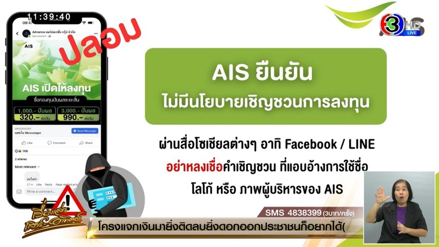 อย่าหลงเชื่อ! AIS ยืนยัน ไม่มีนโยบายชวนการลงทุนผ่านโซเชียล เตือนปชช.อย่าตกเป็นเหยื่อมิจฉาชีพ