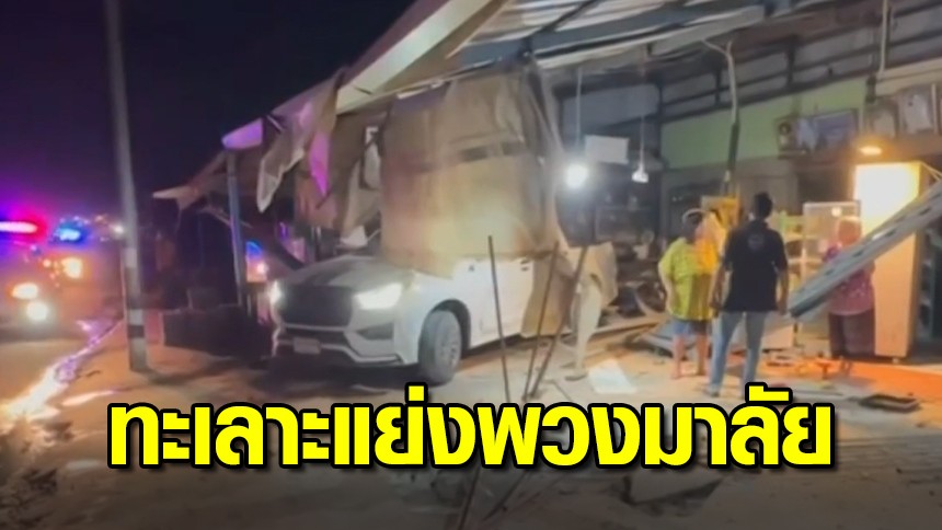 แฟนทะเลาะกัน แย่งพวงมาลัยทำรถกระบะเสียหลัก หมุนพุ่งเข้าบ้าน ชนระเนระนาด โชคดีไร้เจ็บ