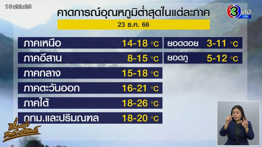 วันที่ 23 ธันวาคม ผู้สื่อข่าวรายงานว่า เช้านี้อุณหภูมิในพื้นที่จังหวัดเลย ยังหนาวต่อเนื่อง มีนักท่องเที่ยวเดินทางมาเที่ยวจังหวัดเลย เป็นจำนวนมาก ยอดภู ต่างๆ อุณภูมิลดลง เลขตัวเดียว ยอดภูเรือ 5 องศา อุทยานแห่งชาติภูกระดึง 6.5 , อุทยานแห่งชาติภูเรือ 5.0 ขณะที่เชียงใหม่ ดอยอินทนนท์เหลือ 4 องศา