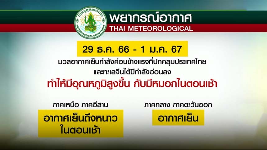 กรมอุตุนิยมวิทยา พยากรณ์อากาศ 24 ชั่วโมงข้างหน้า บริเวณความกดอากาศสูงหรือมวลอากาศเย็นกำลังปานกลางปกคลุมประเทศไทยตอนบน ในขณะที่ลมฝ่ายตะวันตกในระดับบนพัดปกคลุมภาคเหนือ ลักษณะเช่นนี้ทำให้ภาคเหนือยังคงมีอากาศเย็นถึงหนาวกับมีหมอกในตอนเช้า ส่วนภาคตะวันออกเฉียงเหนือ ภาคกลาง และภาคตะวันออกมีอากาศเย็นกับมีหมอกบางในตอนเช้า