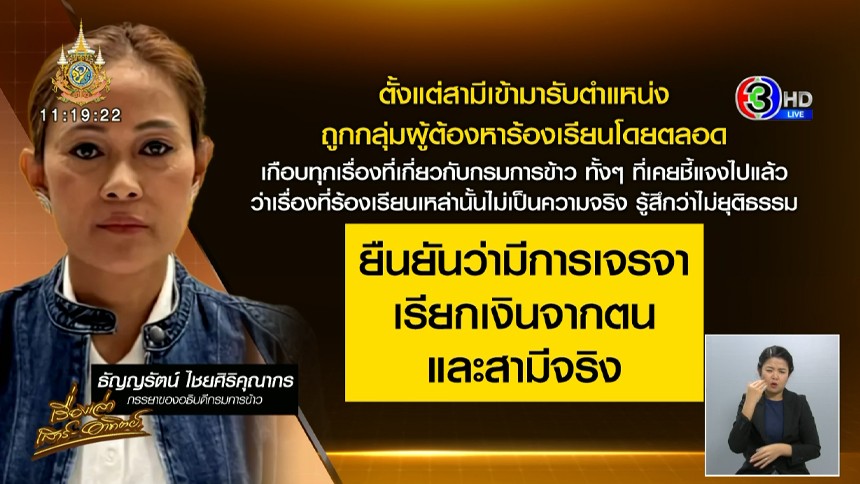 เปิดใจเมียอธิบดีกรมการข้าว ทุกข์ทรมาน โดนกลั่นแกล้งตั้งแต่สามีรับตำแหน่ง ถูกขู่ร้องเรียนออกข่าวแม้ไม่ใช่เรื่องจริง ดิสเครดิตให้เสียหาย ก่อนเกลี้ยกล่อมให้ยอมจ่ายเงินแลกจบทุกปัญหา เชื่อทำเป็นขบวนการ เจ้าตัวเผยถ้าไม่ลุกขึ้นสู้ความจริงก็ไม่ปรากฏ