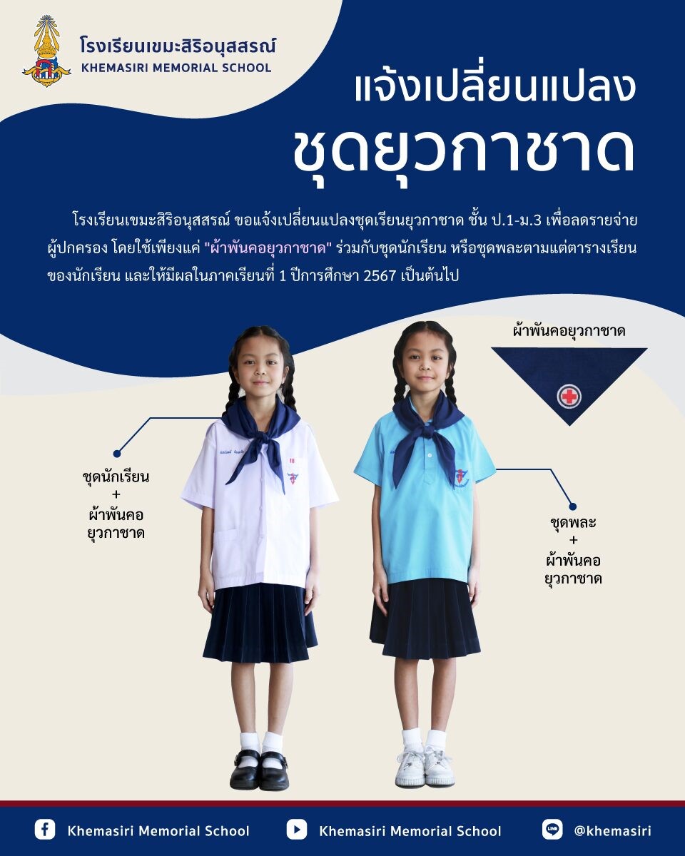 เมื่อวานนี้ (23 ก.พ.67) โรงเรียนเขมะสิริอนุสสรณ์ ได้โพสต์เฟซบุ๊ก แจ้งเปลี่ยนแปลง ชุดยุวกาชาด ระบุว่า “โรงเรียนเขมะสิริอนุสสรณ์ ขอแจ้งเปลี่ยนแปลงชุดเรียนยุวกาชาด ชั้น ป.1-ม.3 เพื่อลดรายจ่ายผู้ปกครอง โดยใช้เพียงแค่ผ้าพันคอยุวกาชาด ร่วมชุดนักเรียน หรือชุดพละ ตามแต่ตารางเรียนของนักเรียน และให้มีผลในภาคเรียนที่ 1 ปีการศึกษา 2567 เป็นต้นไป” พร้อมได้เปิดตัวอย่างของชุดยุวกาชาดที่ใช้เพียงผ้าพันคอ ใส่กับชุดนักเรียน หรือชุดพละ
