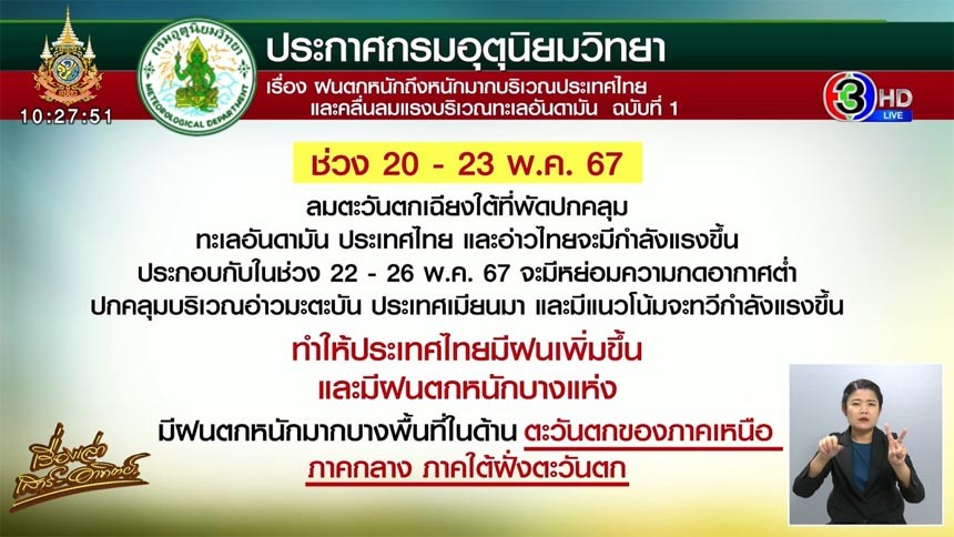 วันนี้ (18 พ.ค.2567) กรมอุตุนิยมวิทยา ออกประกาศฉบับที่ 1 เตือนฝนตกหนักถึงหนักมากบริเวณประเทศไทย และคลื่นลมแรงบริเวณทะเลอันดามัน
