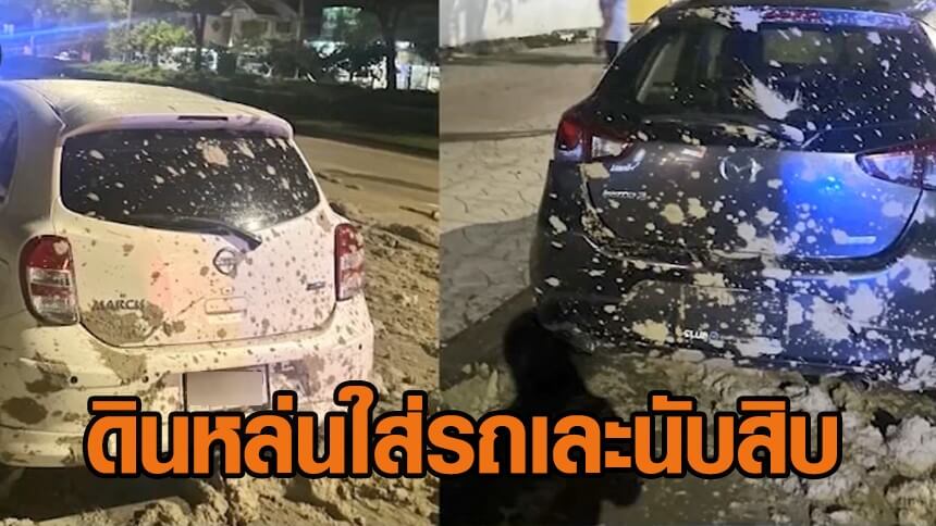 ถนนเละ! รถขนดินโคลน ทำดินหกหล่นใส่รถจอดข้างทาง เสียหาย 10 กว่าคัน