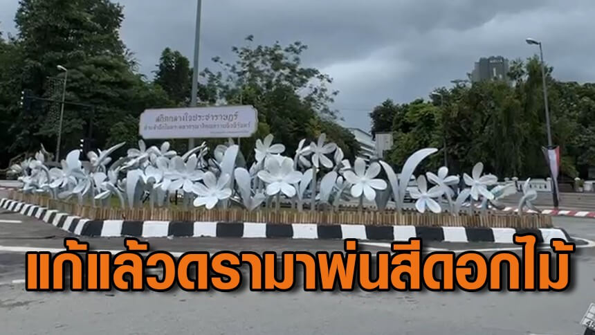 หวังจบดรามา! เจ้าหน้าที่นำดอกไม้มาติดตั้งแล้ว พบพ่นเป็นสีขาว พร้อมทาสีขอบทางจากขาวแดง เป็นขาว-ดำ