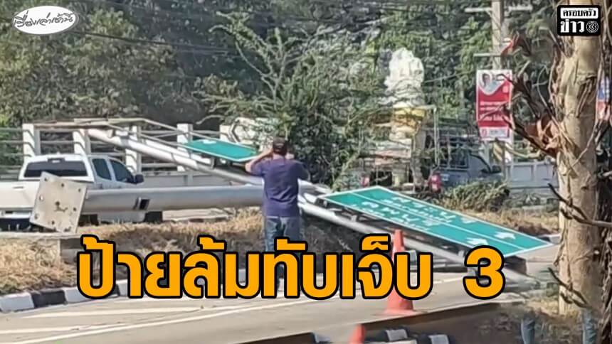 ป้ายบอกทางขนาดใหญ่ล้ม จยย.ชนเจ็บสาหัส 3 คาดถูกขโมยน็อตยึดป้าย