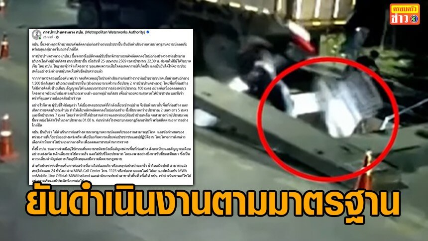 กปน. ยืนยันว่า ได้ดำเนินการก่อสร้างตามมาตรฐานความปลอดภัยของงานสาธารณูปโภค และข้อกำหนดของหน่วยงานที่เกี่ยวข้องอย่างเคร่งครัด เพื่อป้องกันความเสี่ยงต่อประชาชนและผู้ปฏิบัติงาน โดยโครงการดังกล่าวเลือกดำเนินการในช่วงเวลากลางคืน เพื่อลดผลกระทบด้านการจราจร