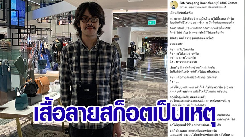 ผู้ใช้เฟซบุ๊กชื่อ Patcharapong Boonchu ของ คิง ภัชรพงษ์ หรือ คิง เดอะวอยซ์ ได้โพสต์เตือนภัย หลังจากได้สวมใส่เสื้อลายสก็อตเที่ยวห้างสรรพสินค้าแห่งหนึ่งในกลางกรุงเทพฯ แต่กลับเจอกลุ่มวัยรุ่นเดินมาเช็กการแต่งกาย จนรู้สึกไม่ปลอดภัย จึงได้โพสต์ผ่านเฟซบุ๊กว่า