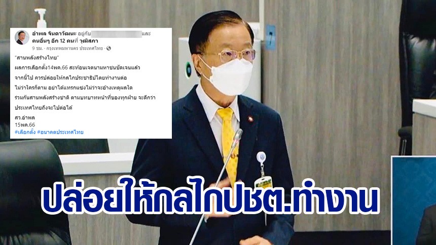 วันที่ 15 พฤษภาคม 2566 หลังจากที่จบการเลือกตั้งไปแล้วนั้น 'อำพล จินดาวัฒนะ' หนึ่งในสมาชิกวิฒิสภา (ส.ว.) ได้เฟซบุ๊กส่วนตัว ว่า "“สานพลังสร้างไทย” ผลการเลือกตั้ง14 พค. 66 สะท้อนเจตนามหาชนชัดเจนแล้ว จากนี้ไป ควรปล่อยให้กลไกประชาธิปไตยทำงานต่อ ไม่ว่าใครก็ตาม อย่าได้แทรกแซงไม่ว่าจะอ้างเหตุผลใด ร่วมกันสานพลังสร้างชาติ ตามบทบาทหน้าที่ของทุกฝ่ายจะดีกว่า ประเทศไทยถึงจะไปต่อได้ สว.อำพล 15 พค. 66"