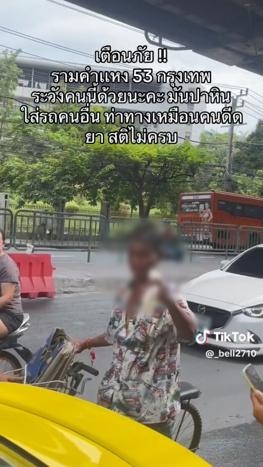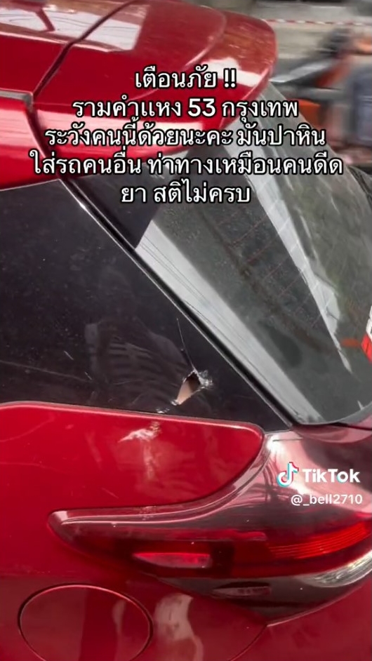 เมื่อวันที่ 9 ก.ค.66 ผู้ใช้ติ๊กต็อกรายหนึ่ง โพสต์คลิปเตือนภัยผู้ใช้รถใช้ถนน หลังถูกชายคล้ายสติไม่ดีถือถุงกาวในมือปาหินก้อนใหญ่ใส่รถจนได้รับเสียหาย โดยระบุข้อความว่า