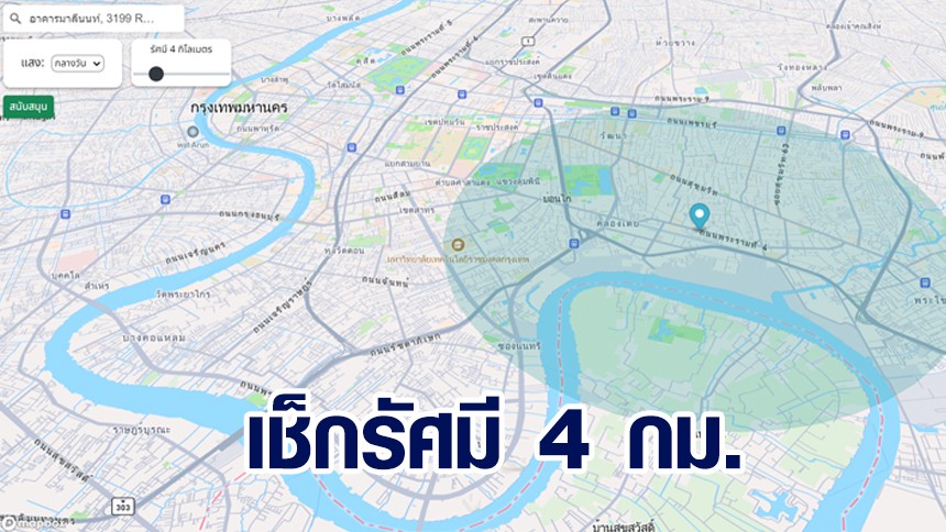 สำหรับการใช้งานก็ไม่ยาก เพียงแค่ลากหมุดไปให้ตรงกับพิกัดที่อยู่ของเรา หรือพิมพ์พิกัดที่อยู่ในช่องค้นหาด้านบน จากนั้นระบบก็จะแสดงผลขอบเขต 4 กม.ให้เราได้ทราบ โดยสามารถเข้าไปลองใช้งานได้ที่ https://4km.jaytnw.com