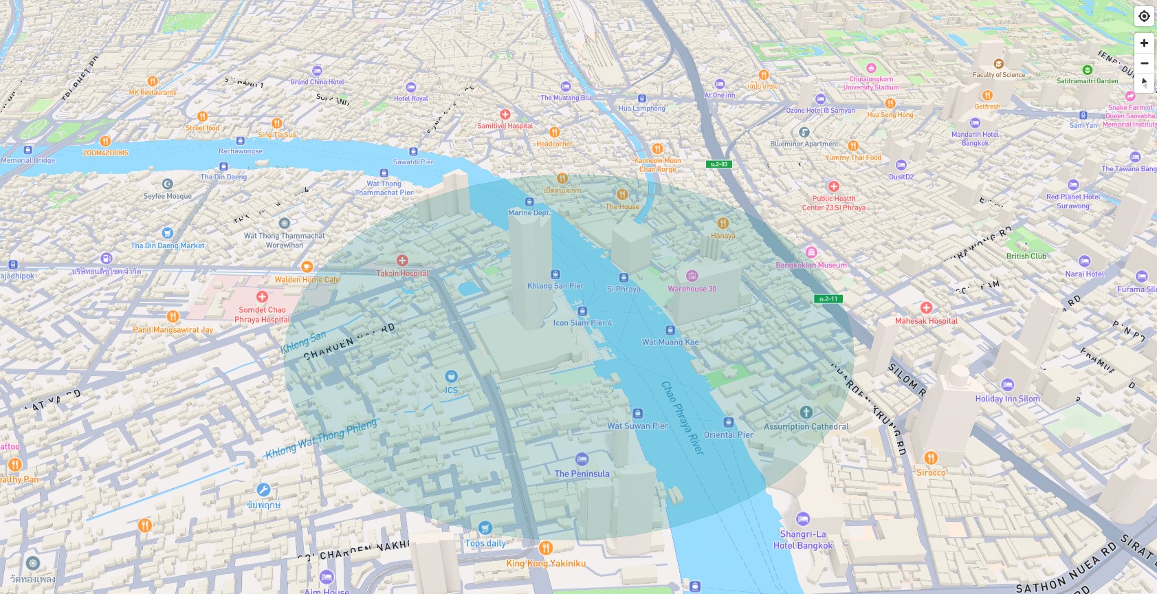 เดี๋ยว feature ต่าง ๆ จะตามมาทีหลัง ขอปล่อยของก่อน 555555 ตอนนี้มีแค่โชว์ตึกกับต้นไม้แบบ 3 มิติ ถ้าเข้าใน Mobile ใช้ 2 นิ้วลากในการเปลี่ยนมุม และองศานะ”